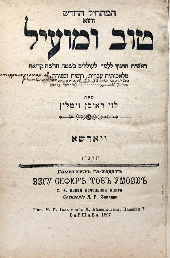 Учебник на русском языке для изучения иврита. Дозволено цензурою. Киев, 18 Апреля 1897 года. Книга, по которой первоклассники могли учиться читать и писать. Однако основная задача пособия состоит в том, чтобы начать формировать у детей любознательность, вызвать у ребенка стремление приобретать новые знания, развивать пытливый ум и усидчивость.