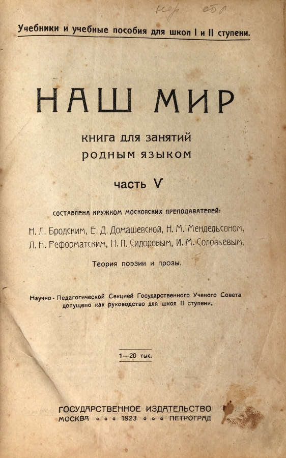 Эта книга для занятий родным языком входит в серию «Учебники и учебные пособия для трудовой школы I и II ступени». Она состоит из нескольких разделов, предназначенных помогать учащимся понимать литературные произведения. Помимо подбора материала и его систематизации, авторы учебника старались вызвать у учеников интерес к вопросам теории словесности и поддержать их в поиске решений различных учебных задач. Учебник был подготовлен коллективом московских педагогов: Бродским Н. Л., Домашевской Е. Д., Мендельсон Н. М., Реформатским Л. Н., Сидоровым Н. П., Соловьевым И. М.