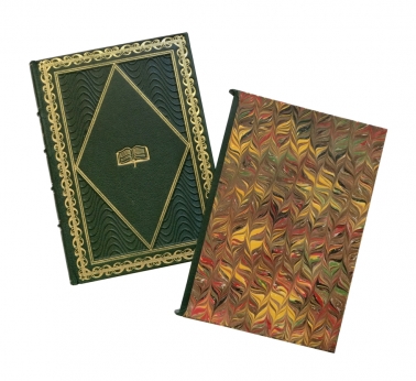 Владельческий переплёт, на крышку переплета наклеен фрагмент оригинальной обложки. Цельнокожаная папка для книги с золотым тиснением. Футляр.