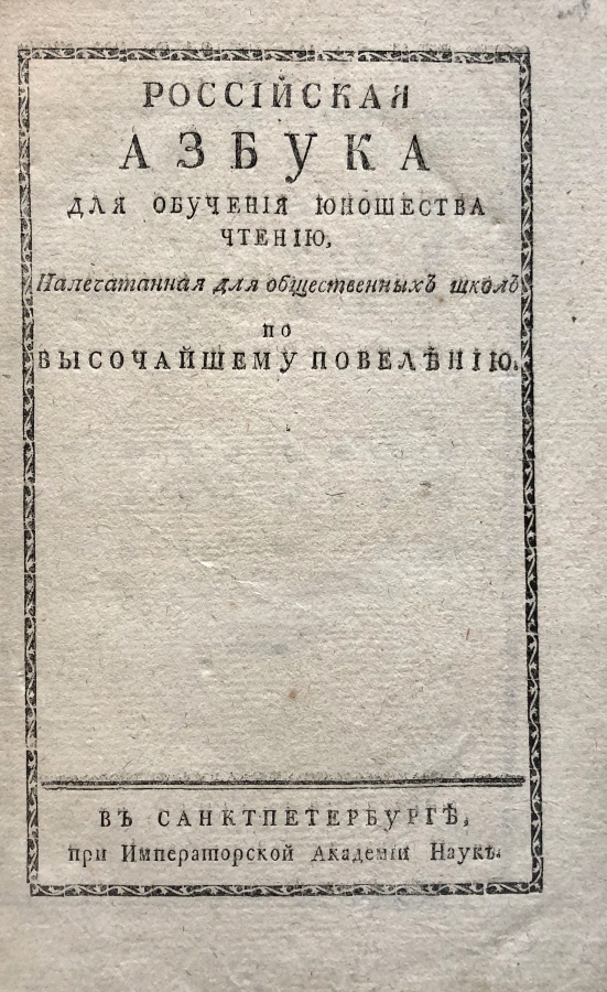 Российская азбука для обучения юношества чтению, напечатанная для общественных школ по высочайшему повелению. Екатерина II стремилась создать новую систему образования. Будучи поклонницей французских энциклопедистов, она поощряла издание учебных книг. Учебные книги в XVIII в. печатались почти без иллюстраций. Поэтому неудивительно, что «Российская азбука для обучения юношества чтению» имеет весьма скромный внешний вид. Издание украшено только наборными рамками и линейками на всех страницах. Книга представляет историческую и культурную ценность.