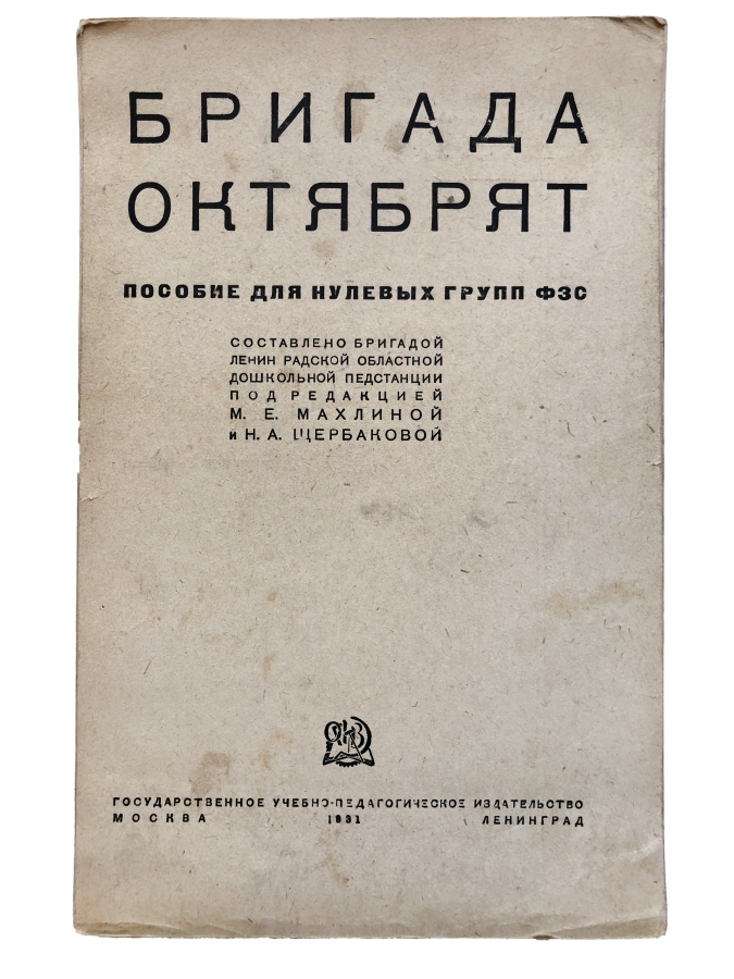 Бригада октябрят — это пособие для нулевых групп ФЗС («Фабрично-Заводская Семилетка»). Под редакцией М. Е. Махлиной и Н. А. Щербаковой. В первую группу (1 класс) дети должны были поступать уже грамотные с представлением о сезонности природных явлений, организованными в дружный коллектив, знакомые с путями передвижения до школы и домой. Для формирования таких первокласников и служило данное пособие. Книга представляет историческую и культурную ценность.