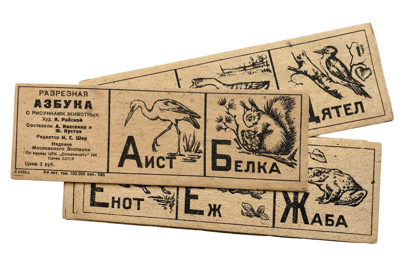 Одиннадцать издательских карточек. Художник И. Райской, составители А. Ивансенко и Ф. Кустов. Издание московского Зоопарка. Одиннадцать карточек с буквами и иллюстрациями. По три буквы на карточке. Черно-белые иллюстрации. Издание представляет историческую и культурную ценность.