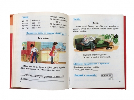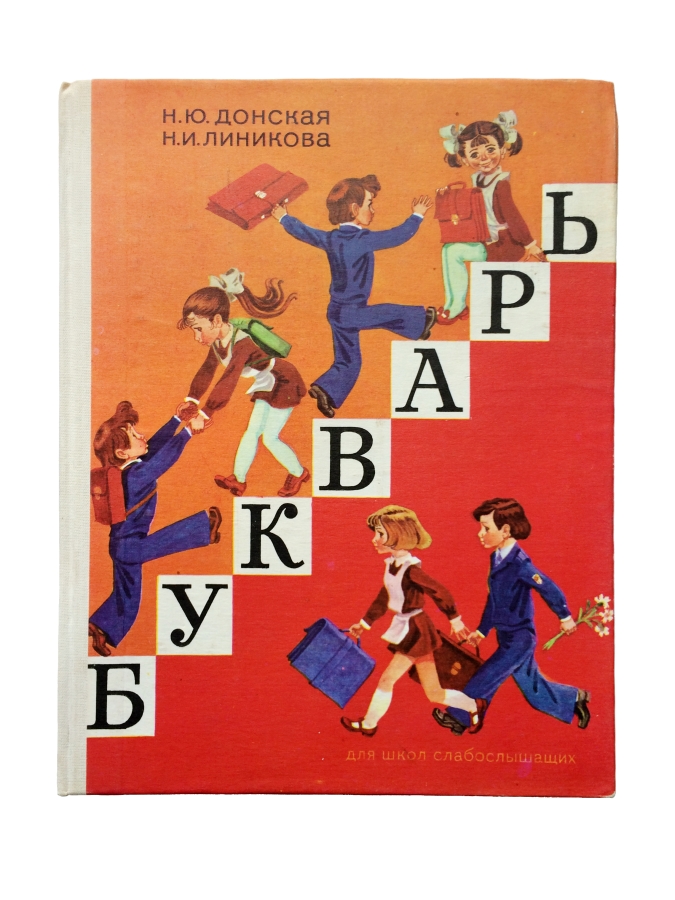 Очень красочное издание с многочисленными цветными иллюстрациями, крупным шрифтом, цветными форзацами. Настоящее издание рекомендовано к использованию Главным управлением школ Министерства просвещения СССР в качестве основного учебника по обучению грамоте учащихся с нарушением слуха различной этиологии. Изучение буквы начинается со слогов, слов, коротких предложений, небольших текстов. На каждую букву 2-3 страницы.