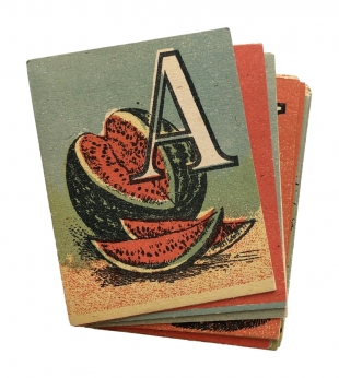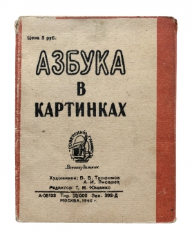 Миниатюрная азбука-картинка с подвижными буквами из плотного картона. Каждая карточка с буквой украшена яркой иллюстрацией. Художники: В.В,Трофимов, А.И.Писарев