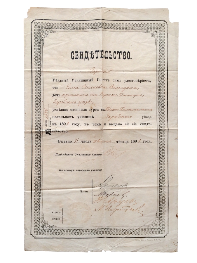 Текст свидетельства: "Уездный Училищный Совет сим удостоверяет, что Елена Семеновна Кололухина, дочь крестьянина, успешно окончила курс в начальном училище Зарайского уезда в 1899 году, в чем и выдано ей сие свидетельство."