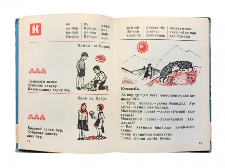 Букварь для 1-го класса. Книга, по которой дети могли учиться читать и писать. На каждой странице букваря — иллюстрация, отражающая дух эпохи. Лакский язык — язык лакцев, входящий в нахско-дагестанскую семью. Один из 14 официальных языков Дагестана, на нём говорит около 146 тысяч человек.