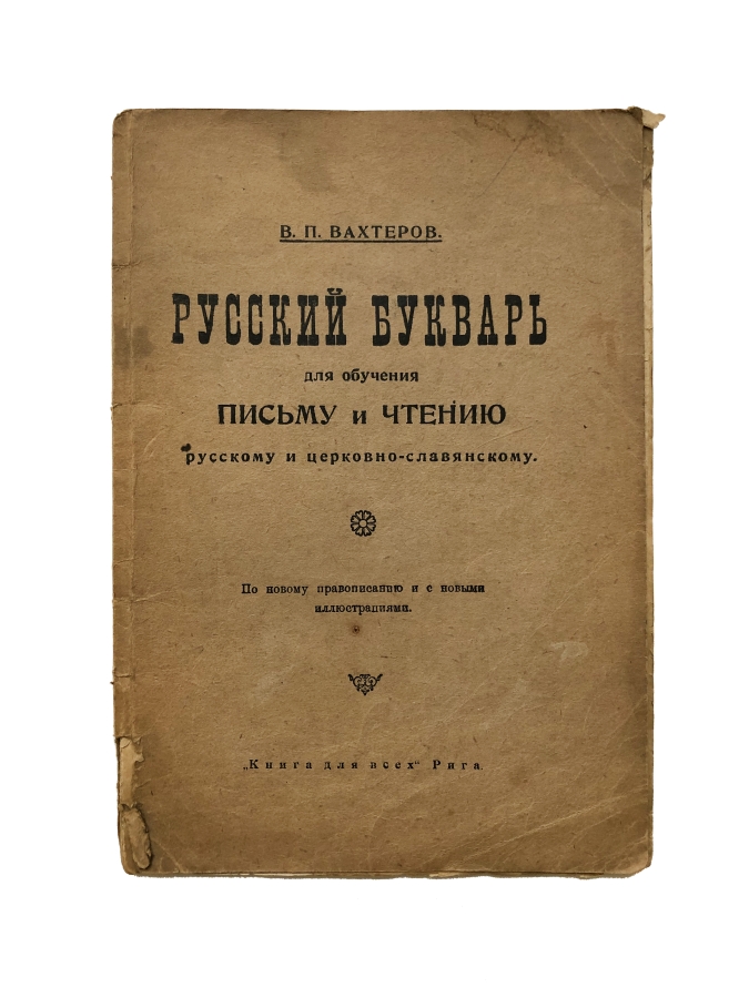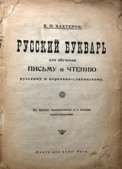 «Русский букварь для обучения письму и чтению» известного педагога Василия Порфирьевича Вахтерова (1853-1924) впервые увидел свет в Москве в 1898 г. в издательстве И.Д. Сытина и до 1917 г. выдержал в дореволюционной России 118 переизданий. С конца 1917 по 1919 гг. сытинские издания букваря учили детей уже новой орфографии (издания 119-125). На территории советской России книга издавалась вплоть до 1923 года и в других городах: Одесса, Харьков, Иркутск, Ростов на Дону. Одновременно в Праге, Риге, Берлине, Париже и в Нью Йорке букварь выходил и в русских эмигрантских издательствах. Последний раз книга была выпущена в Риге в 1936 году. Несмотря на большие тиражи «Русский букварь» Вахтерова встречается крайне редко, как и все азбуки и буквари; особенно редки эмигрантский издания. Книга представляет историческую и культурную ценность!