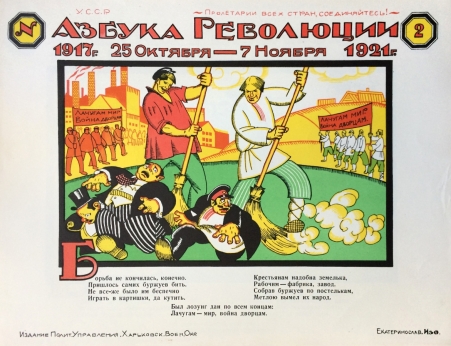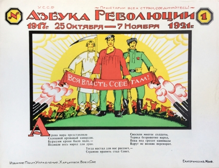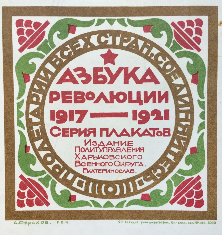Серия плакатов "Азбука революции", выполненная украинским художником Адольфом Страховым, была впервые издана в 1921 году. Главная тема этого комплекта — жизнь молодой Советской республики в первые послереволюционные годы. "Азбука революции", не смотря на не вполне совершенную литературную форму своих стихов-подтекстовок, явилась значительным явлением в агитационном искусстве 1920-х годов и, впоследствии, в 1969 году была переиздана Киевским издательством "Мистецтво".