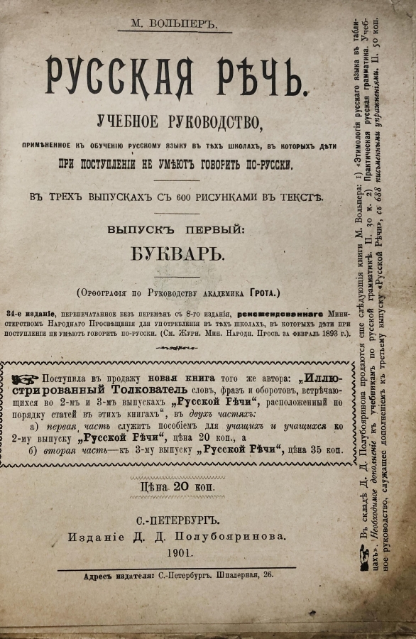 Вольпер Михаил Иоакимович — педагог и писатель, род. в 1851 году в Вильне. Его книга "Русская речь", учебное руководство по русскому языку применительно к потребностям инородческого населения, пользовалась особой популярностью. Руководящие заметки о преподавании русского языка по руководствам того же автора: "Русская речь" и "Практическая русская грамматика", примененным к обучению русскому языку в тех школах, в которых дети при поступлении не умеют говорить по-русски. Книга представляет историческую и культурную ценность!