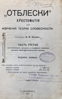 Книга для чтения и изучения родного языка. Хрестоматия «Отблески» состоит преимущественно из тех произведений, которые в художественной форме выражают светлое бодрое настроение и любовь человека к Богу, к жизни, природе, к людям, родине, труду, героизму и вообще ко всему тому, что составляет красоту и величие человека. Как учебное пособие, эта книга предназначается для систематического изучения родного языка. Книга представляет историческую и культурную ценность!
