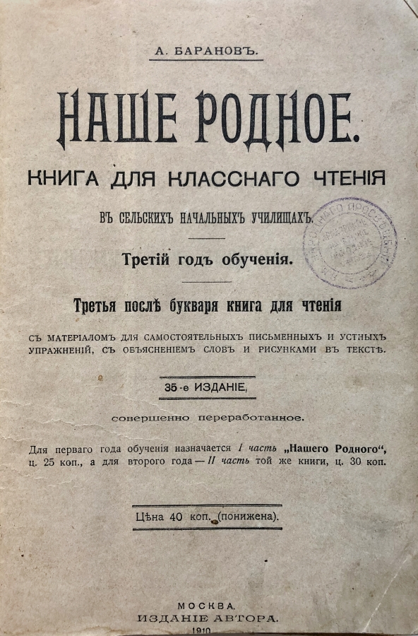 "Наше родное" — это русский и церковно-славянский букварь. Книга предназначена для классного чтения во время третьего года обучения в сельских начальных училищах. С вопросами для устных пересказов, объяснением слов, письменными упражнениями и рисунками в тексте. Книга представляет историческую и культурную ценность!