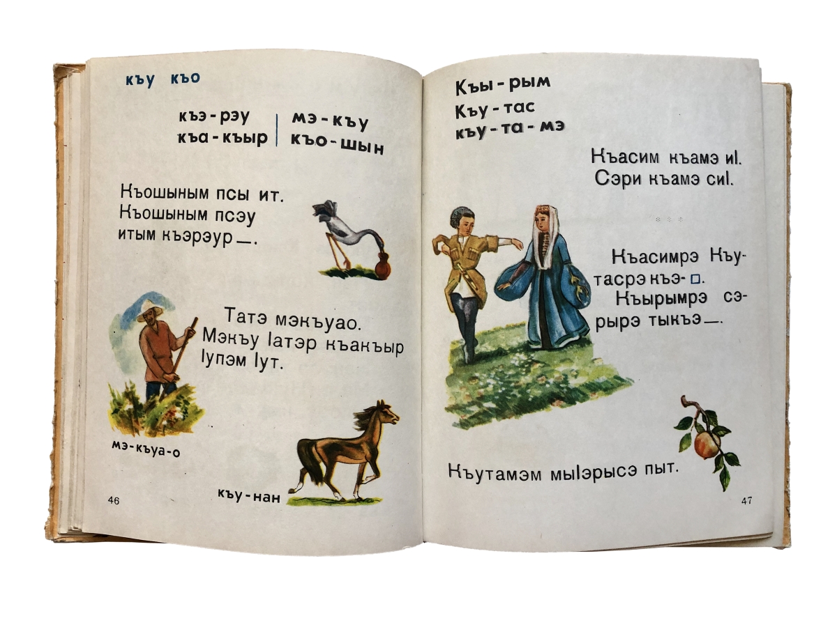 Книга, по которой первоклассники могли учиться читать и писать на адыгейском языке. Как и большинство букварей все начинается с простых букв с картинками, которые постепенно переходят в слоги, слова, предложения и несложные тексты. Художник Владимир Глуховцев.