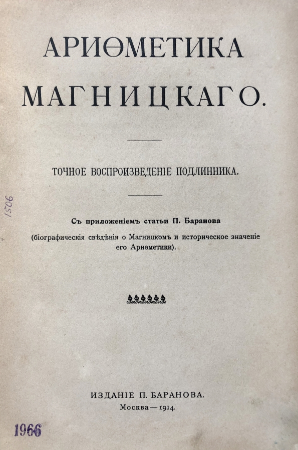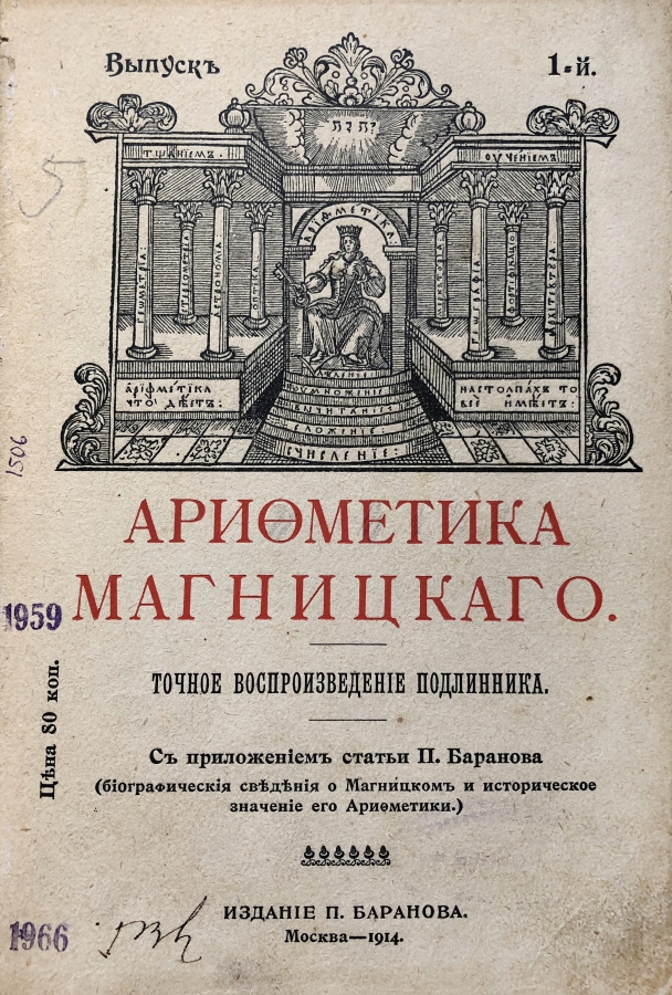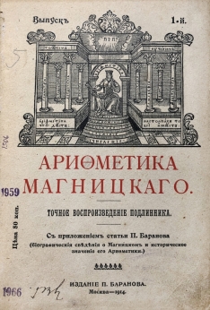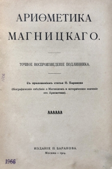 Точное воспроизведение подлинника. С приложением статьи П. Баранова, биографические сведения о Магницком и историческом значении его Арифметики. Арифметика Магницкого — первый печатный курс математики на славянском языке, сыгравший важную роль в истории преподавания математики в России. Составлен Леонтием Филипповичем Магницким. Книга издана в 1703 году, а написана, по-видимому, до 1700 года. Книга представляет историческую и культурную ценность!