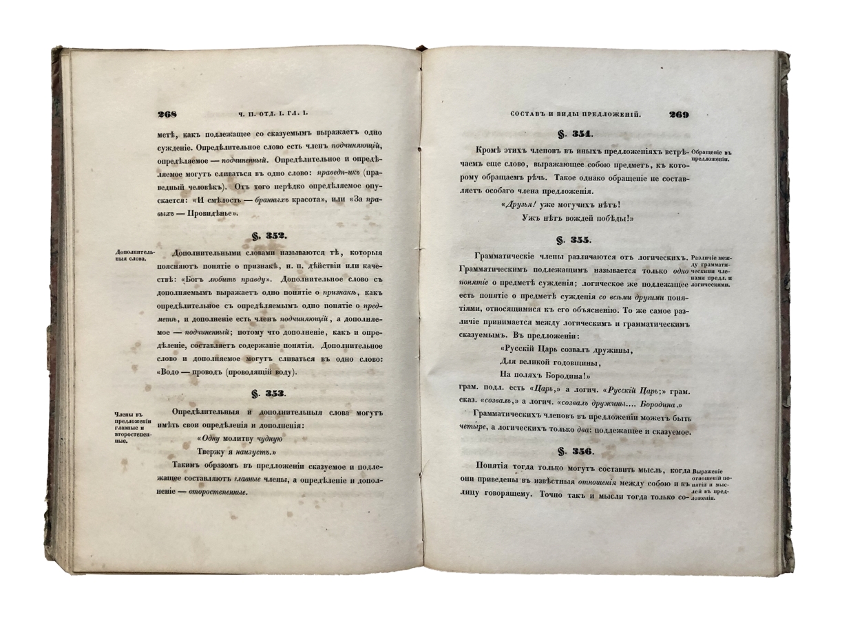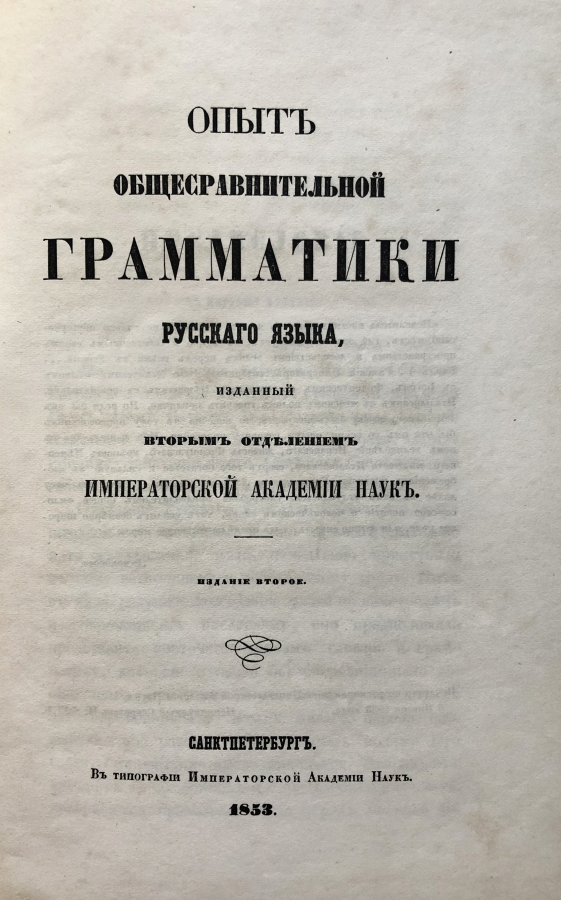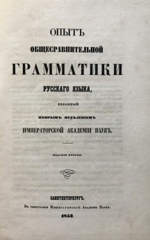 Опыт общесравнительной грамматики русского языка, изданный Вторым отделением Императорской Академии наук. Учебник содержит материал по всем разделам курса русского языка: дается характеристика его лексического и фразеологического состава, освещаются вопросы фонетики, теории письма и словообразования, излагается учение о частях речи и их грамматических категориях. Книга представляет историческую и культурную ценность!