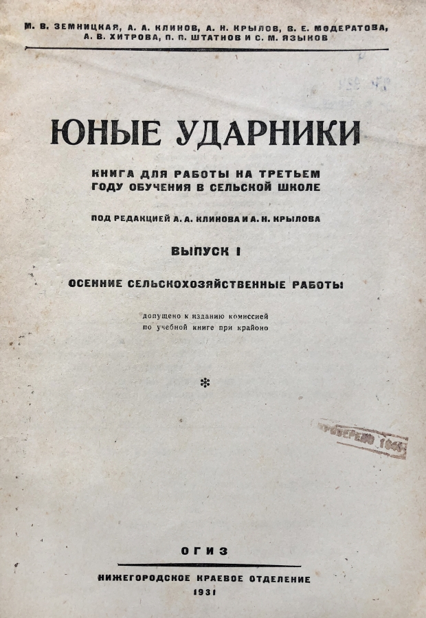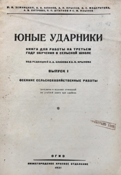 Книга для работы на 3-ем году обучения в сельской школе. Выпуск первый: Осенние сельскохозяйственные работы. Авторы учебника: М.В.Земницкая, А.А. Клинов, А.Н.Крылов, В.Е.Модератова, А.В.Хитрова, П.П.Штатнов, С.М.Языков. Книга представляет историческую и культурную ценность!