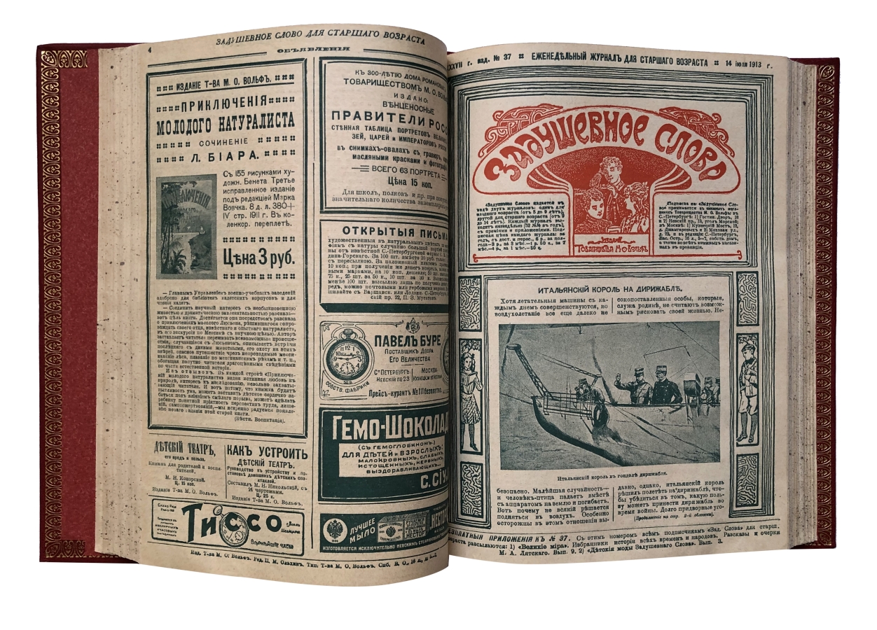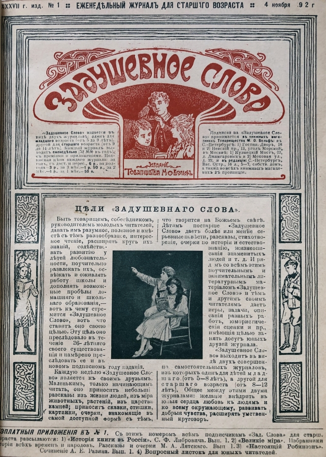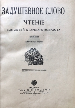«Задушевное слово» — иллюстрированный журнал для семейного чтения. В журнале для старшего возраста публиковались избранные повести и рассказы, характеристики и биографии замечательных людей, рассказы из истории, географии и естественных наук, популярные занимательно написанные статьи по всем отраслям наук, путешествия, приключения и открытия на суше и на море, стихотворения, театральные пьесы, игры, занятия, задачи, ребусы. Страницы журнала украшены рисунками известнейших художников. Как в литературном, так и в типографском отношении журнал превосходит все издания подобного рода того времени. Журнал «Задушевное слово» является ярчайшим выразителем дореволюционного понимания идеального воспитания и представляет собой огромный культурологический и эстетический интерес для общества. Книга представляет историческую и культурную ценность!