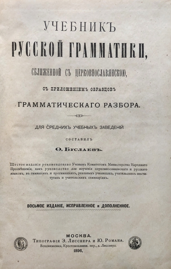 Учебник русской грамматики, сближенной с церковно-славянскою, с приложением образцов грамматического разбора. Это один из наиболее популярных в России гимназических учебников, созданный выдающимся русским филологом и педагогом Ф. И. Буслаевым. Учебник состоит из двух частей: в первой рассмотрены звуки, буквы, образование и особенности изменения частей речи, сложные слова, во второй — виды и состав предложений, характер синтаксического употребления частей речи, простое и сложное предложение. В приложении рассматривается порядок слов и даются образцы грамматического разбора. Книга представляет историческую и культурную ценность!