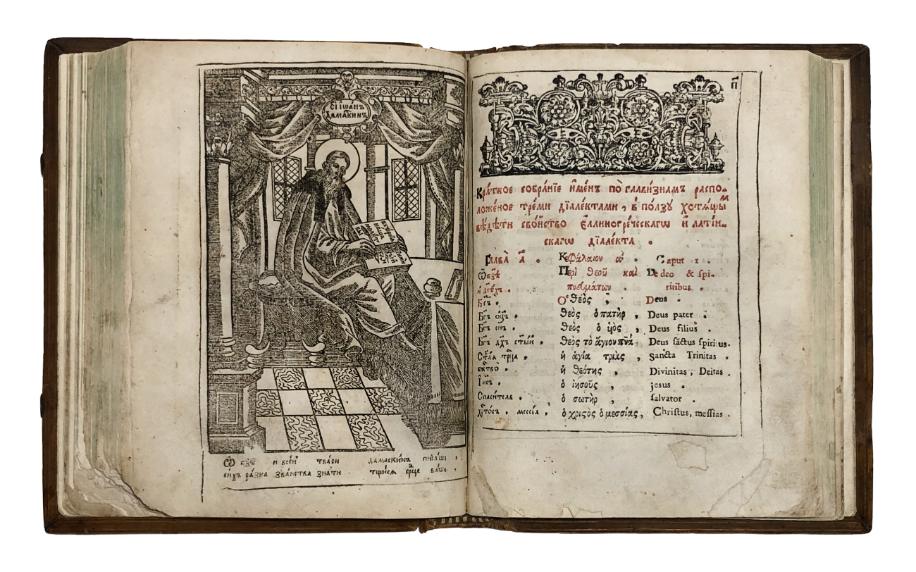 Кожаный переплет с тиснением. 131 печатный лист. Утрачено 28 листов, в т. ч. 3 часть. Вставлено пустых 22, 23 лист. Из отдельных гравюр сохранена только Иоанна Дамаскина. Набор: 20, 17, 22-23, ок. 33 строк. Шрифт: 10 строк = 72 мм, 83 мм, 60 мм, 47 мм (кириллица), 60 мм, 50 мм, ок. 30 мм (греческий и латинский). Стандартный формат.