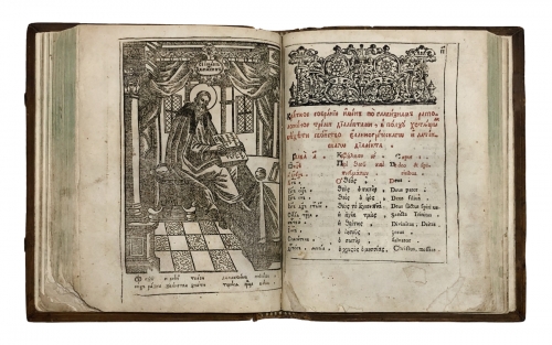 Страницы в линейных рамках. Орнамент: заставки, концовки. В книге 7 гравюр: Сошествие св. Духа на апостолов, Богоматерь на троне, Моисей получает скрижали, Григорий Богослов, Иоанн Дамаскин, Св. Геннадий, Василий Великий. Под гравюрами стихи. В тексте два изображения школы, отрок Иисус во храме, Богоматерь и семь медальонов с изображением таинств.