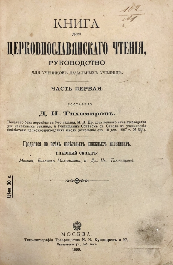 Книга для церковнославянского чтения, руководство для учеников начальных училищ. Дмитрий Иванович Тихомиров (1844-1915) — педагог, деятель народного образования, издатель и редактор. Книга представляет историческую и культурную ценность! Прижизненное издание!
