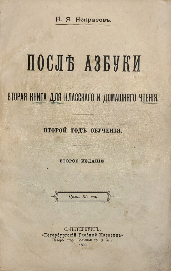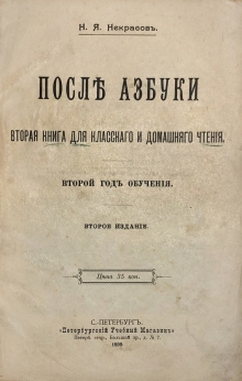 Вторая книга для классного и домашнего чтения. Николай Яковлевич Некрасов — выдающийся общественный деятель и помещик. Он избрал педагогическое поприще и долго преподавал в школе. Уже в первые годы учительства он убедился, что ей не хватает полезных и недорогих учебников. Нашёлся и единомышленник в лице тёзки Николая Яковлевича Егмина, и в 1881 г. ими был издан букварь под названием «Азбука к мудрости ступенька: Для начальных училищ». Логическим продолжением букваря явилось составленное Некрасовым издание «После азбуки». Книга представляет историческую и культурную ценность!