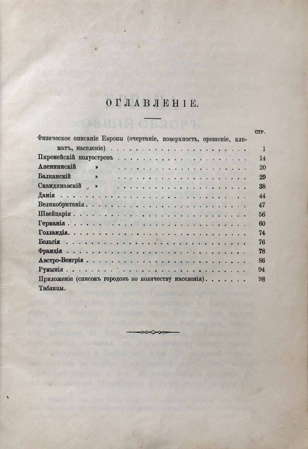 В книге содержатся 9 цветных карт и 26 таблиц с рисунками в приложении. Главы в книге: Физическое описание Европы, Пиренейский, Апеннинский, Балканский, Скандинавский полуострова, Дания, Великобритания, Швейцария, Германия, Голландия, Бельгия, Франция, Австро-Венгрия и Румыния.