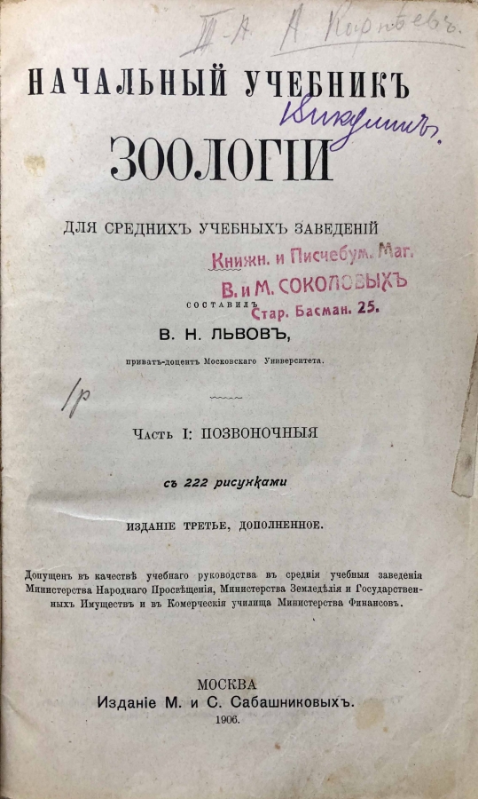 Начальный учебник зоологии для средних учебных заведений. Из предисловия: Этот учебник зоологии позвоночных составлен на основе программы по зоологии в реальных училищах. Автор старался подбирать сведения, доступные для учеников соответствующих классов. И из громадного зоологического материала выбирал сведения, которые помогали бы учащимся выстроить взаимосвязь между животным и его образом жизни.