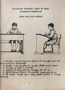 Фрагмент из книги: Как правильно сидеть во время письма: 1. Ступни всей подошвой опускаются на пол или на скамейку. 2. Туловище прямое, голова слегка наклонена вперед. 3. Грудь не опирается на стол. 4. Расстояние между глазами от книги: 30 до 35 см. 5. Локти упираются в стол чуть дальше края.