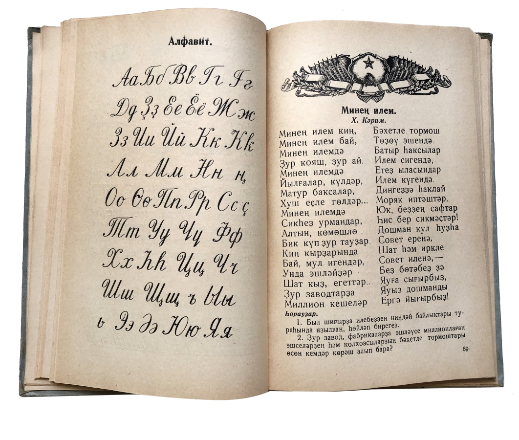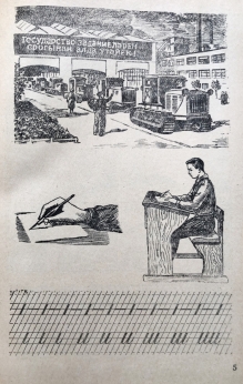 Учебное пособие для обучения взрослых на башкирском языке. Первые шаги становления молодого советского государства были направлены на воспитание строителей социалистического будущего: грамотных, идеологически подкованных и свободных от буржуазных предрассудков. Одной из приоритетных задач была ликвидация неграмотности и воспитание квалифицированных рабочих кадров. Учебные пособия отвечали не только за овладение азбучными истинами и техникой незамысловатого арифметического счёта. Идеологическая подоплёка составляла их основу. Тематические буквари проводили сравнения советского и капиталистического образа жизни, шаг за шагом разъясняли победоносную роль Красной Армии в освобождении рабочих и крестьян от гнёта старого режима, пропагандировали ведущую роль политических лидеров молодой Страны Советов, агитировали за поддержание санитарно-гигиенических норм на производстве и в личной жизни каждого советского человека.