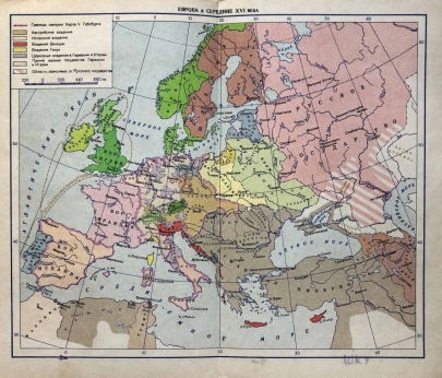 Издательский картонаж. Есть потертости на переплете. 8-е изд. Вложены карты к учебнику "История средних веков" Учпедгиз. 1961 г.