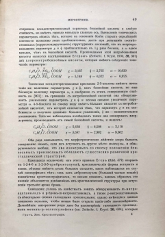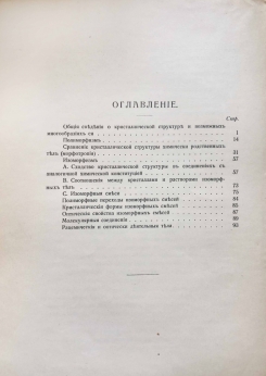 Содержание: Общие сведения о кристаллической структуре и возможных многообразиях ее, Полиморфизм, Сравнение кристаллической структуры химически родственных тел (морфотропия), Изоморфизм (Сходство кристаллической структуры в соединениях с аналогичной химической конституцией, Соотношения между кристаллами и растворами изоморфных тел, Изоморфные смеси), Полиморфные переходы изоморфных смесей, Кристаллические формы изоморфных смесей, Оптические свойства изоморфных смесей, Молекулярные соединения, Рацемические и оптически деятельные тела.