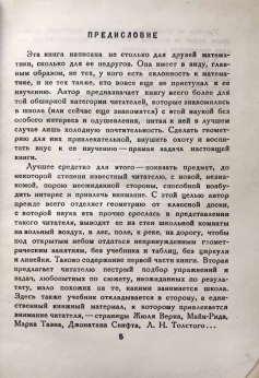 Предлагаемое классическое пособие Я. И. Перельмана призвано пробудить у читателя интерес к геометрии или, говоря словами автора, "внушить охоту и воспитать вкус к ее изучению". Наука выводится "из стен школьной комнаты на вольный воздух, в лес, поле, к реке, на дорогу, чтобы под открытым небом отдаться непринужденным геометрическим занятиям без учебника и таблиц...". Автор отсылает юных читателей за примерами к произведениям Л. Н. Толстого и А. П. Чехова, Жюля Верна и Марка Твена и предлагает пестрый подбор любопытных по сюжету задач.