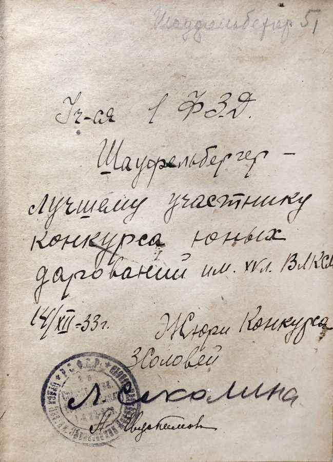 Коленкоровый издательский переплет. Владельческие дарственные надписи на форзаце. Печати несуществующих библиотек.