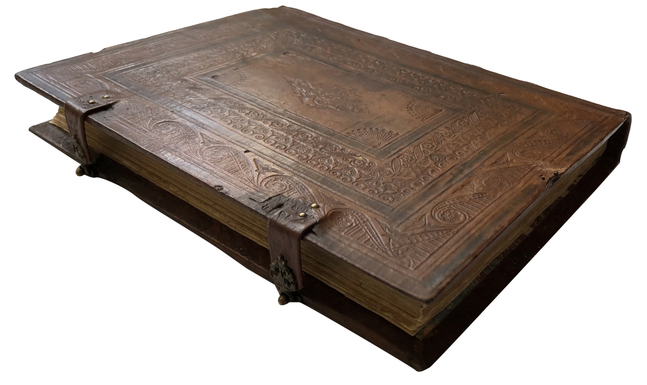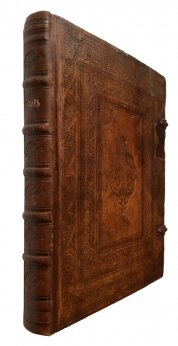 Цельнокожаный переплет эпохи. В качестве основания крышек использовались доски. Есть потертости на переплете. Кожаные застежки. Редкие пятна на страницах.