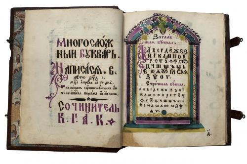 Букварь рукописный, цветной, украшен узорными орнаментами, заставками, буквицами и инициалами. В книге есть старославянская азбука, примеры написания слогов и слов, тексты для узучения. Книга представляет историческую и культурную ценность! Рукописные книги — это большая редкость!