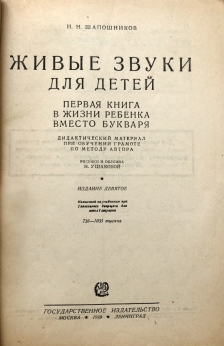 "Живые звуки для детей" — первая книга в жизни ребенка вместо букваря. Дидактический материал при обучении грамоте по методу автора книги. Шапошников И. Н. строил обучение грамоте по методу "живых звуков". Безбукварный метод обучения грамоте это обучение без букваря, по любой книге, применяя аналитический метод обучения грамоте. С буквами дети знакомились по разрезной азбуке, которая состояла из карточек картона с наклеенными на них буквами, вырезанными из наждачной бумаги. Ребёнок произносил звуки, обводил буквы пальцем или палочкой, т.е. повторял движения, необходимые для письма. Постепенно учась находить букву, соответствующую определённому звуку, и набирать из них целые слова, дети научались читать. Книга представляет историческую и культурную ценность!