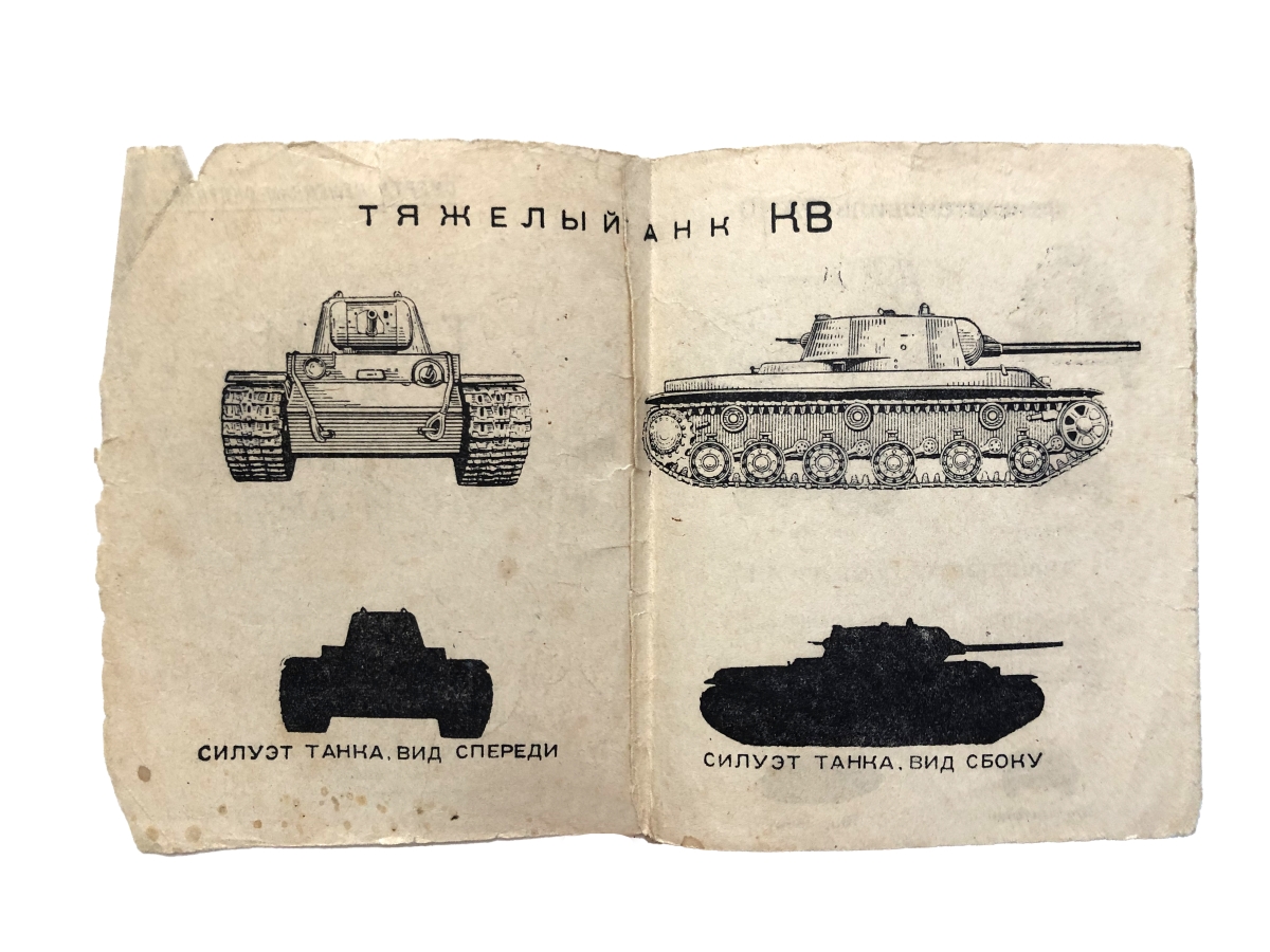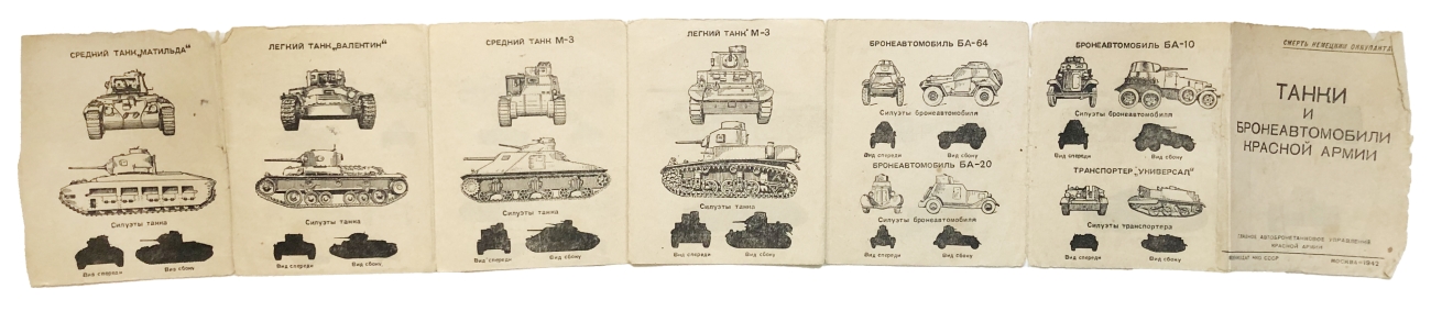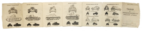 Буклет "Танки и бронеавтомобили Красной Армии" сделан в виде книжки гармошки. На каждой странице черно-белое изображения танка (вид сбоку и спереди), а также силуэта этого танка.