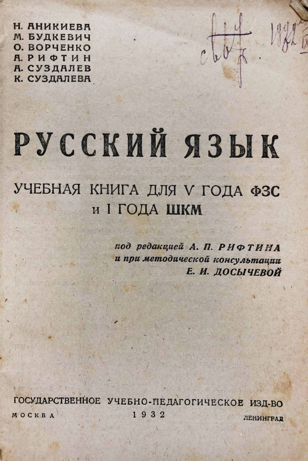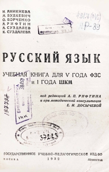 Учебник русского языка для 5 года ФЗС (фабрично-заводские семилетки) и I года ШКМ (школа крестьянской молодежи). Фабрично-заводские семилетки (ФЗС) — разновидность семилетней школы в промышленных центрах и районах. Школа крестьянской молодежи (ШКМ), являющаяся продолжением школы I ступени для сельской молодежи.