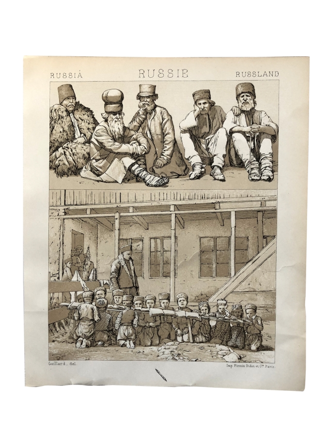 На верхней части гравюры изображены мужчины в крестьянских и купеческих нарядах. На нижней части изображены дети, читающие во дворе школы.